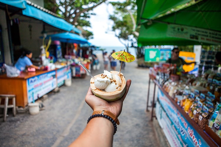 If you get get peckish while you’re on the beach, it’s easy to flag down a food vendor and grab a seaside snack. These touts offer everything from BBQ chicken and fried fish, to ice cream, papaya salad and sticky rice. As with other street food, this is one of the cheapest ways to dine.