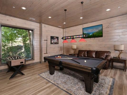 Enjoy a fun and exciting vacation in the mountains in a luxury cabin with game room. These beautiful homes are located in some of the most breathtaking destinations in America, including in Tennessee's Great Smoky Mountains and on the ski slopes of Colorado. Choose from cabins with games rooms and hot tubs for relaxing on chilly winter days, or cabins with private pools and games rooms for active summertime adventures. We also offer a range of cabins with pool tables and cabins with game room and indoor pools, so all types of amenity are available in our range.