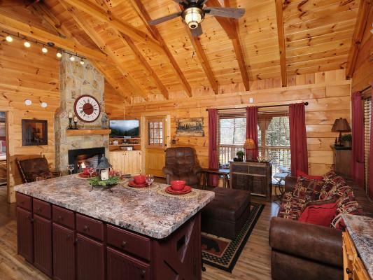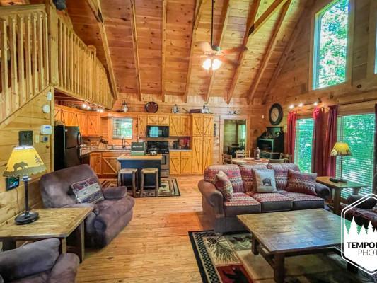 Our Pigeon Forge 1-bedroom cabins offer a comfortable space for couples. Each cabin features modern amenities, including fully-equipped kitchens, cozy furnishings, and outdoor areas with scenic views.